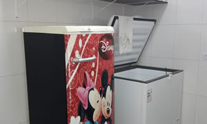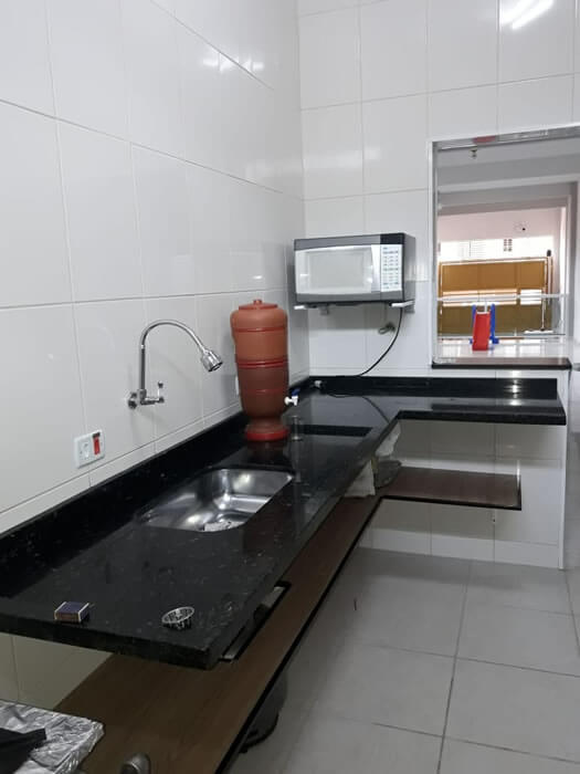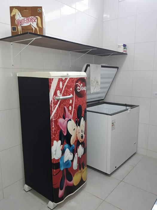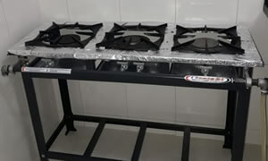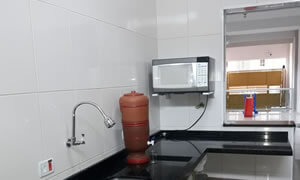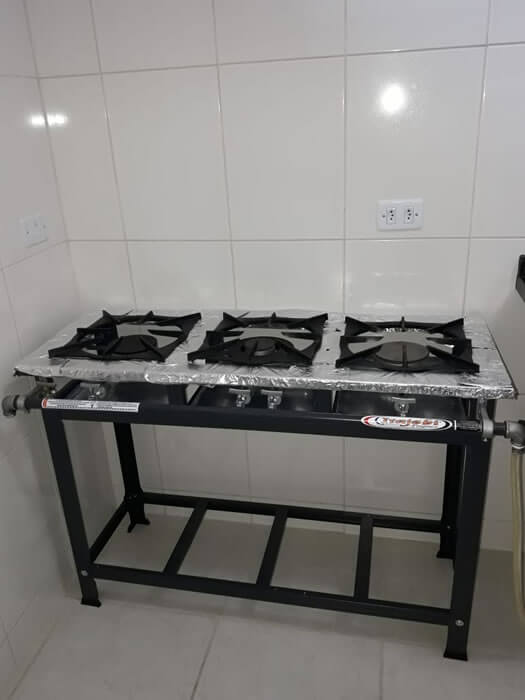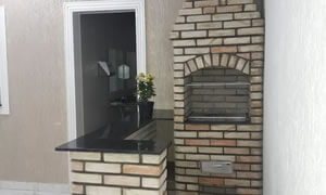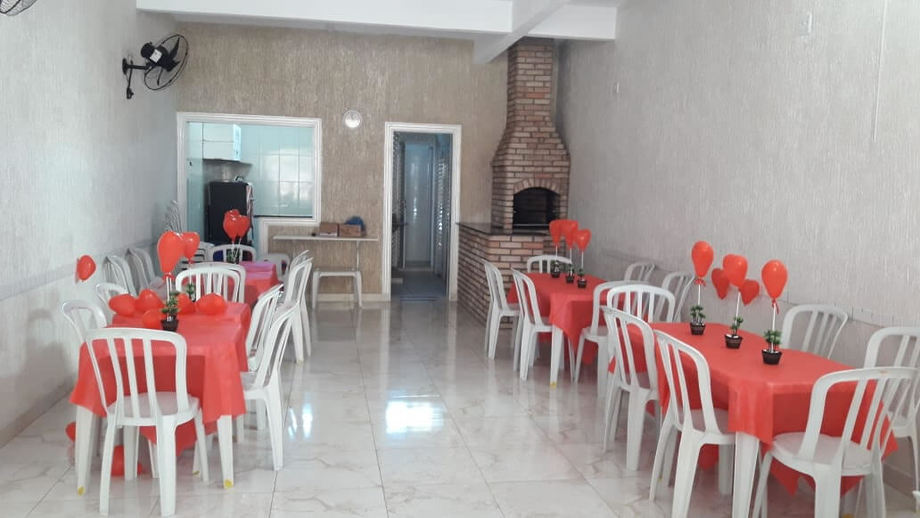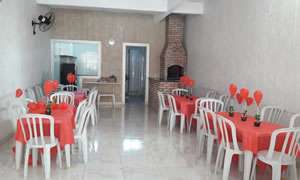 Salão equipado com Fogão Industrial, Micro-ondas, Freezer, Geladeira e Churrasqueira.